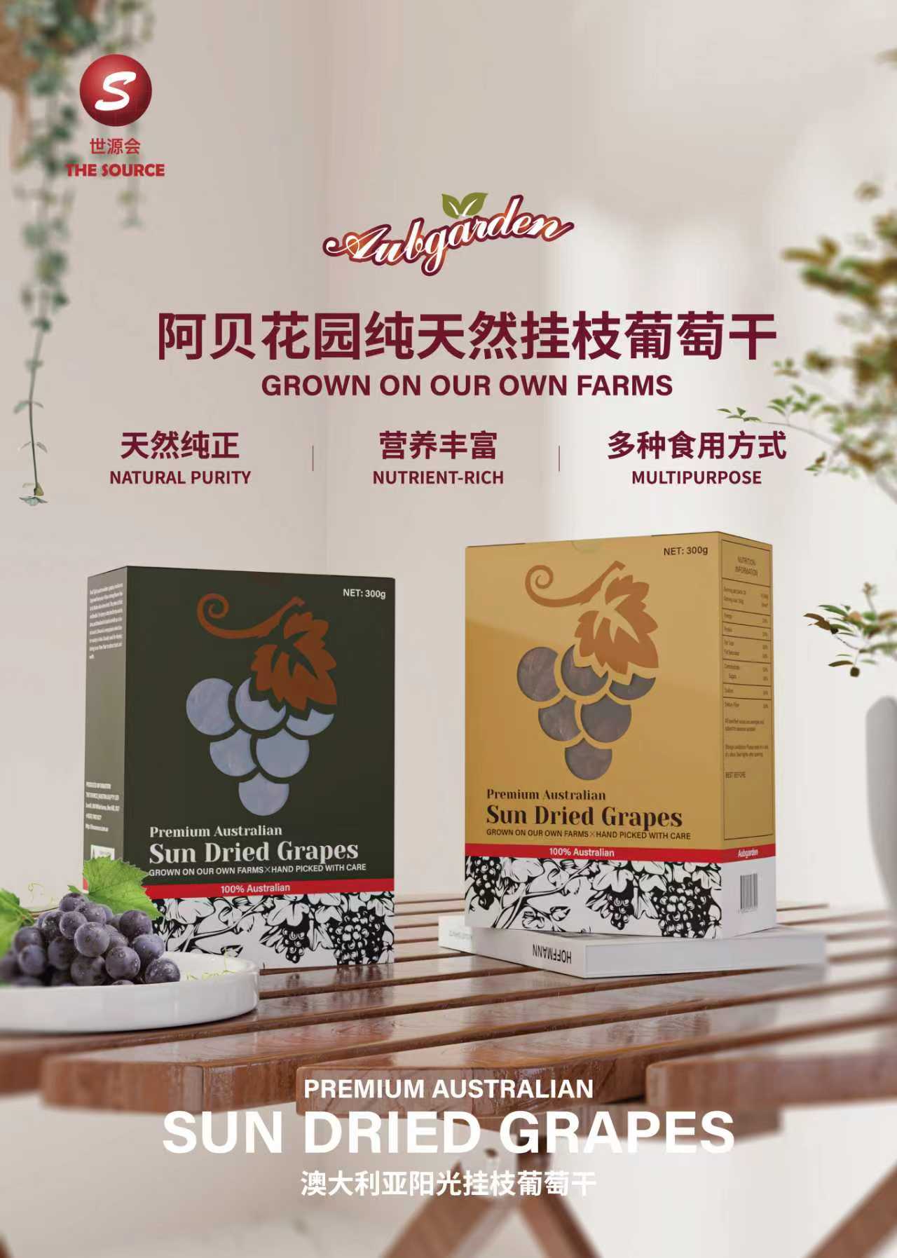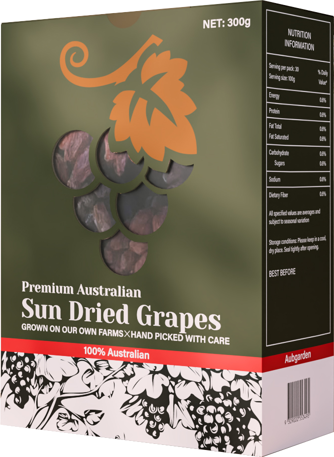 Aubgarden Raisins — grown in Australia’s sun-drenched vineyards, each raisin captures the natural sweetness and gift of nature. Aubgarden maintains strict standards in grape cultivation, selecting only premium varieties to ensure natural sweetness and rich nutrition. Once perfectly ripened, the grapes are carefully handpicked and sun-dried using traditional methods to preserve their original flavour and nutrients — with no added colours or preservatives. Taste the pure essence of nature in every bite.